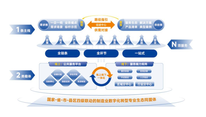 重点聚焦轻工、电子信息、机械、汽车、食品等广东优势产业集群,以“链式改造”为路径,构建“底层资源汇聚—载体能力支撑—多维度服务覆盖—行业精准落地”的服务体系,依托线上制造业数字化转型公共服务平台与线下服务能力矩阵两类载体,汇聚资源要素,形成转型服务赋能、要素资源保障、生态氛围营造、场景模式推广的四维服务能力,面向制造业企业提供产品选型、评估测试、技术验证、实施改造、数据共享、供需对接、人才培训、政策宣贯等数字化转型一站式、全链条数字化公共服务。