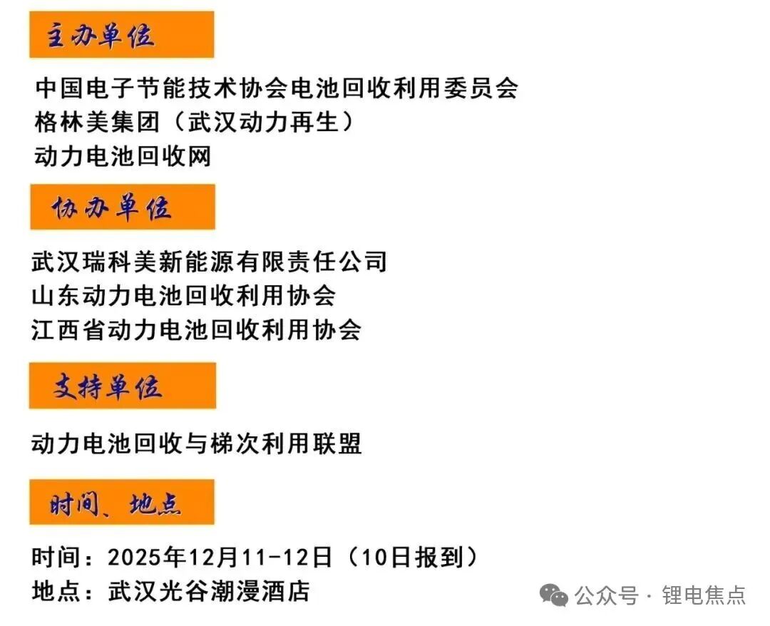 12月11日在武汉光谷潮漫凯瑞国际酒店将举办“中国动力电池回收利用行业回收年会暨新型、高效提锂技术发展论坛”