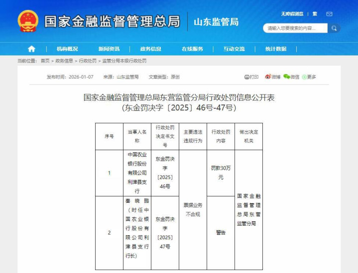 齐鲁网·闪电新闻1月8日讯1月7日,国家金融监督管理总局东营监管分局公布行政处罚信息(东金罚决字〔2025〕46号-47号),中国农业银行股份有限公司利津县支行因“票据业务不合规”的违法违规行为,被处以30万元罚款;时任该行行长的袁晓鹏同步被给予警告处罚,作出处罚决定的机关均为国家金融监督管理总局东营监管分局。